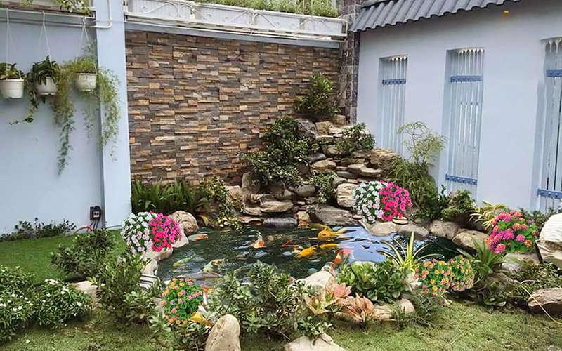Loại này thường phù hợp cho những ngôi nhà có diện tích sân vườn rộng rãi. Diện tích có thể xây được bể cá hòn non bộ ngoài trời có diện tích từ vài mét vuông đến vài chục mét vuông. Nhưng thực tế, không có quy định nào về kích thước để xây dựng, bạn chỉ cần xây làm sao giúp hài hòa với diện tích và không gian là được. Dưới đây, Dương Minh Châu sẽ gợi ý một số vị trí xây bể cá hòn non bộ ngoài trời bạn có thể tham khảo nhé: